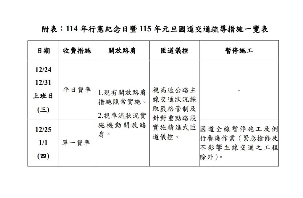 12/25、元旦國道疏運措施出爐 !採單一費率收費 、停路肩恐噴6千